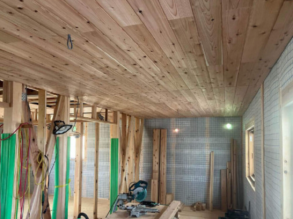 天井と壁の断熱工事にはセルロースファイバーを施工します。断熱施工前の木下地の取り付けが完了しました。