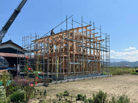 晴天の下、上棟がはじまりました。柱と梁がどんどん組み上がっていきます。