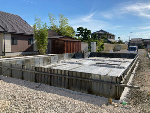 いよいよ着工、基礎工事がはじまりました。基礎外周の型枠組みが完了しています。