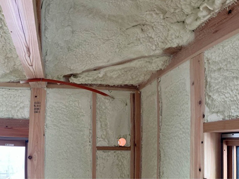壁の断熱工事がすすんでいます。断熱欠損がおこらないようにしっかりと施工していただいています。