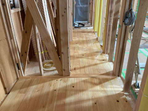 天井の羽目板張りが完了しました。続いてフロア張りへとすすんでいきます。
