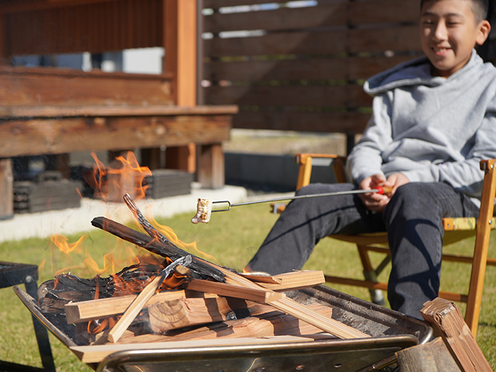 焚火台で火をおこしてコーヒーを淹れたり、焼きマシュマロも。