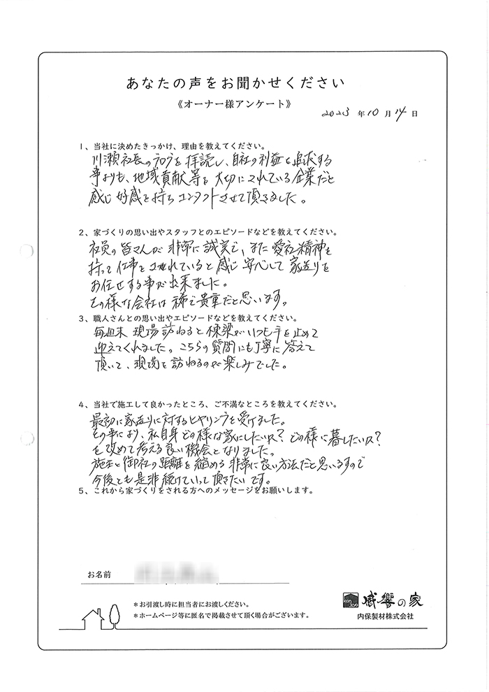 社員の皆さんが非常に誠実で、また愛社精神を持って仕事をされていると感じ、安心して家造りをお任せする事が出来ました。そのような会社は稀で貴重だと思います。