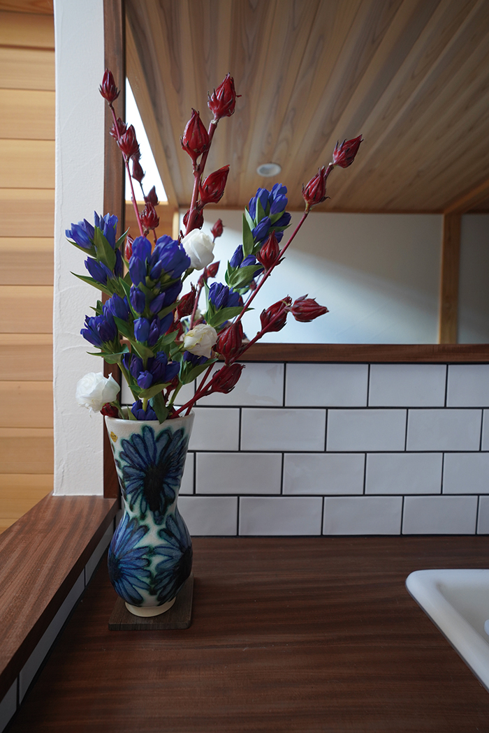 洗面コーナーを彩るお花は、生け花が得意なMさんの手によるもの