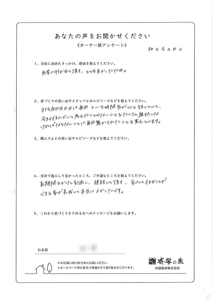 長期間をかけて計画し、建設して頂き、、安心して住むことができる家が完成して本当によかったです。